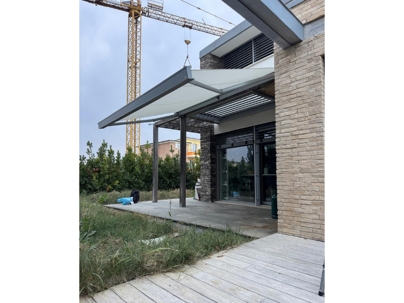 In questa realizzazione in provincia di Macerata abbiamo installato la tenda da sole cassonata Qubica Light KE, caratterizzata da linee essenziali e pulite che si integrano perfettamente con l’architettura dell’abitazione. Il progetto ha previsto anche l’intervento su una struttura in legno esistente, sulla quale abbiamo installato Kedry Plus T, bioclimatica a lamelle orientabili nella versione tetto, priva di pilastri.