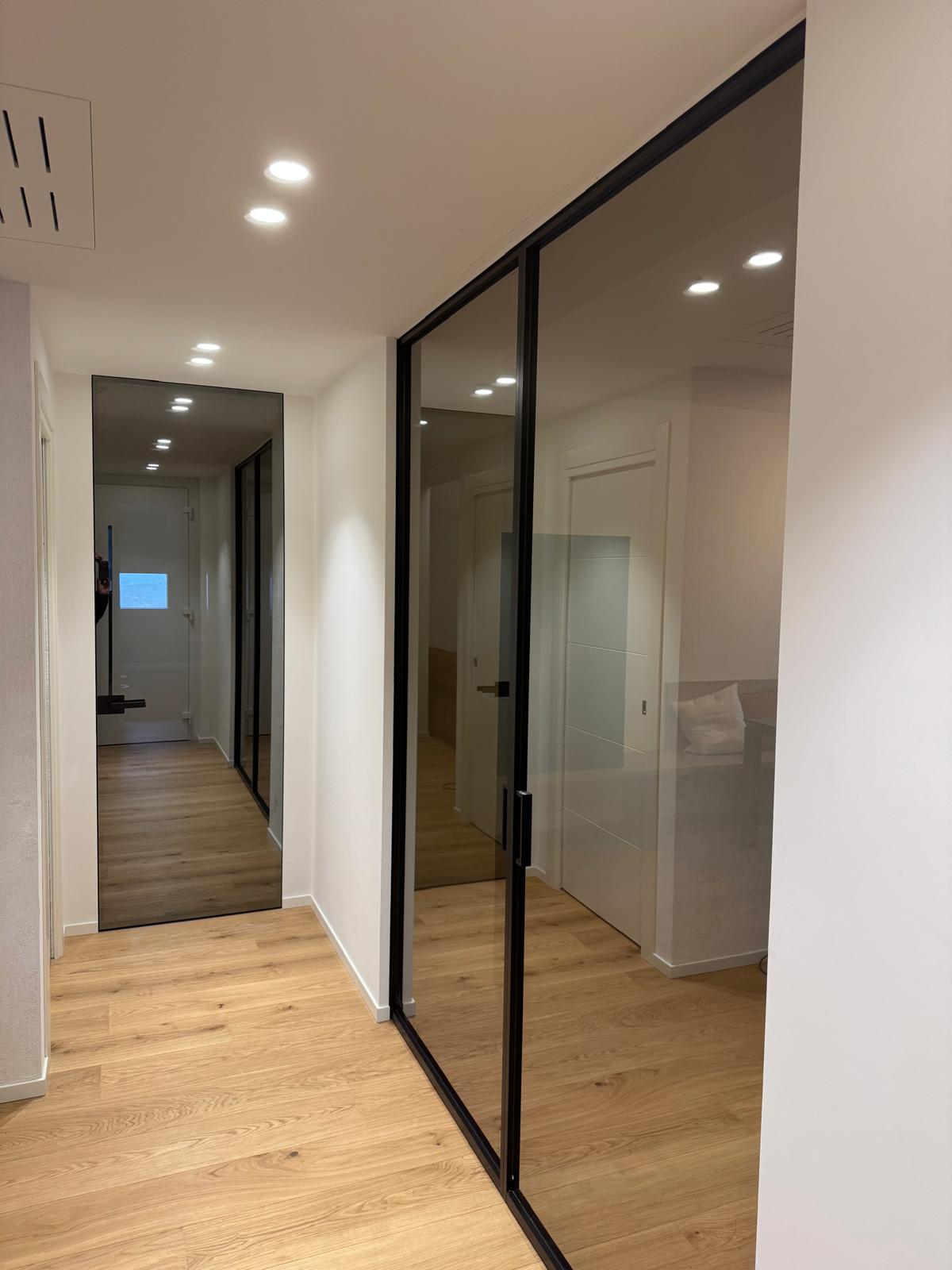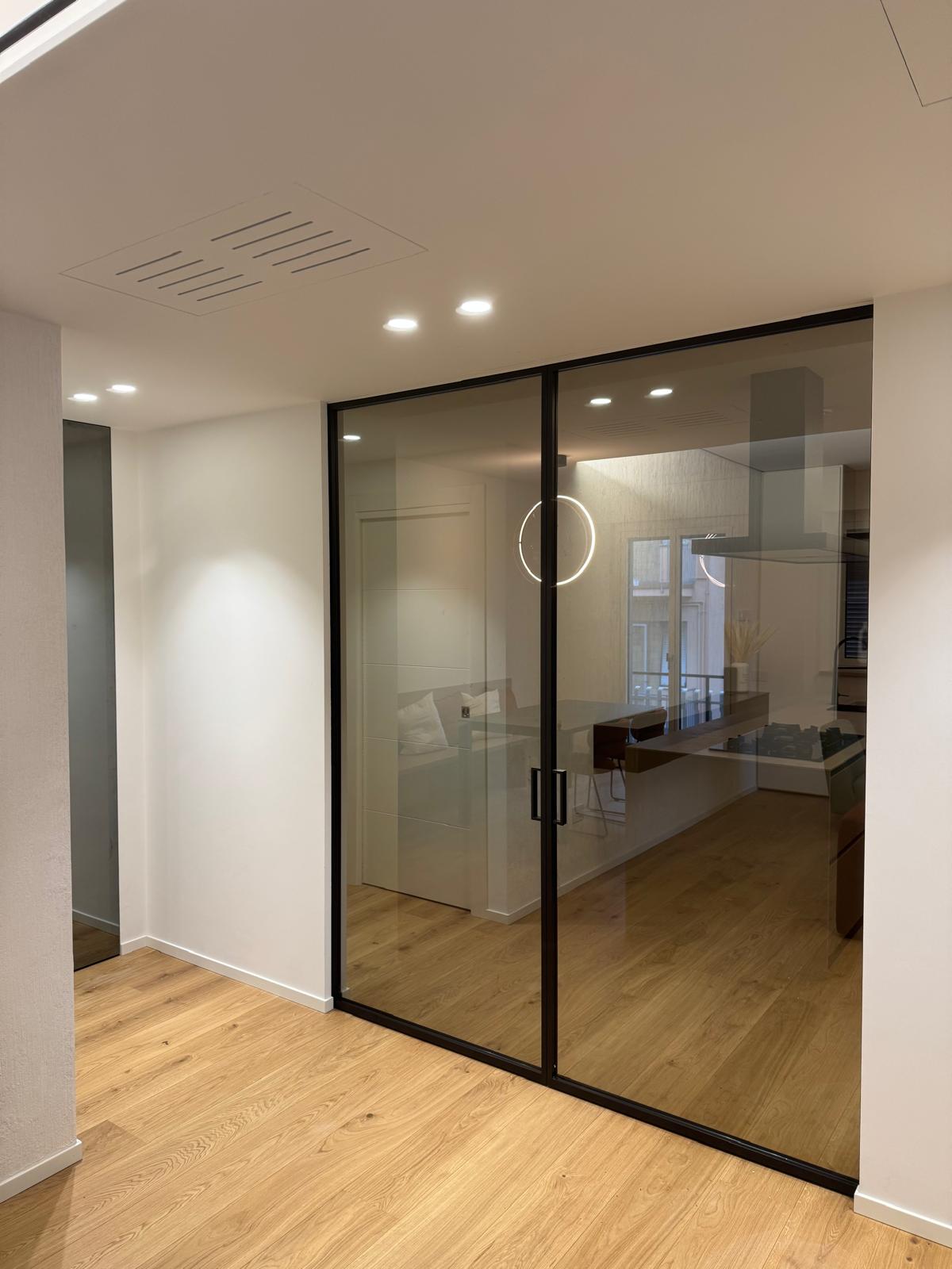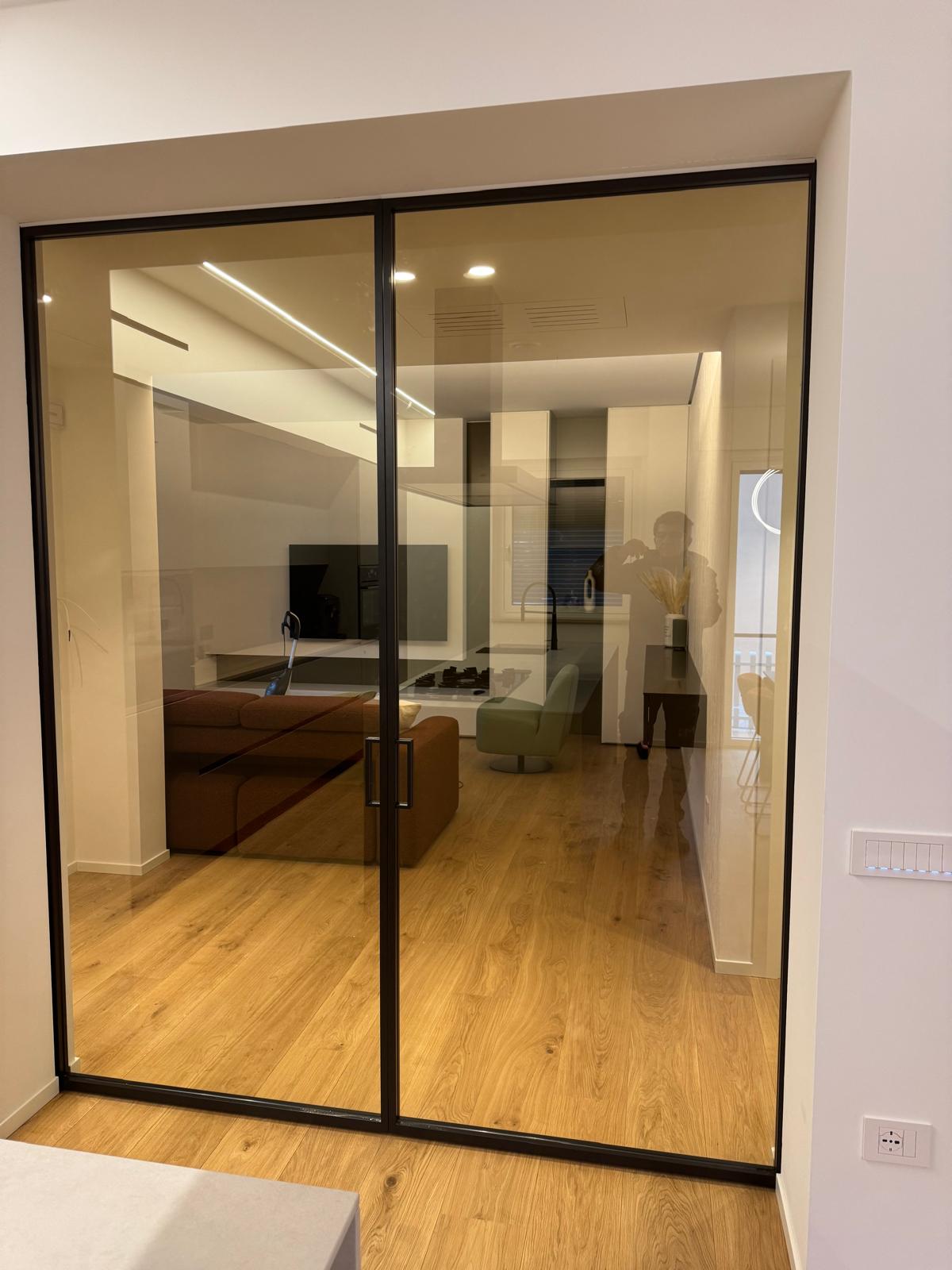 Per dare personalità ed eleganza agli spazi interni, abbiamo proposto le porte in vetro Eclisse, sia in versione scorrevole, che battente, con telaio color tobacco e vetro bronzo.